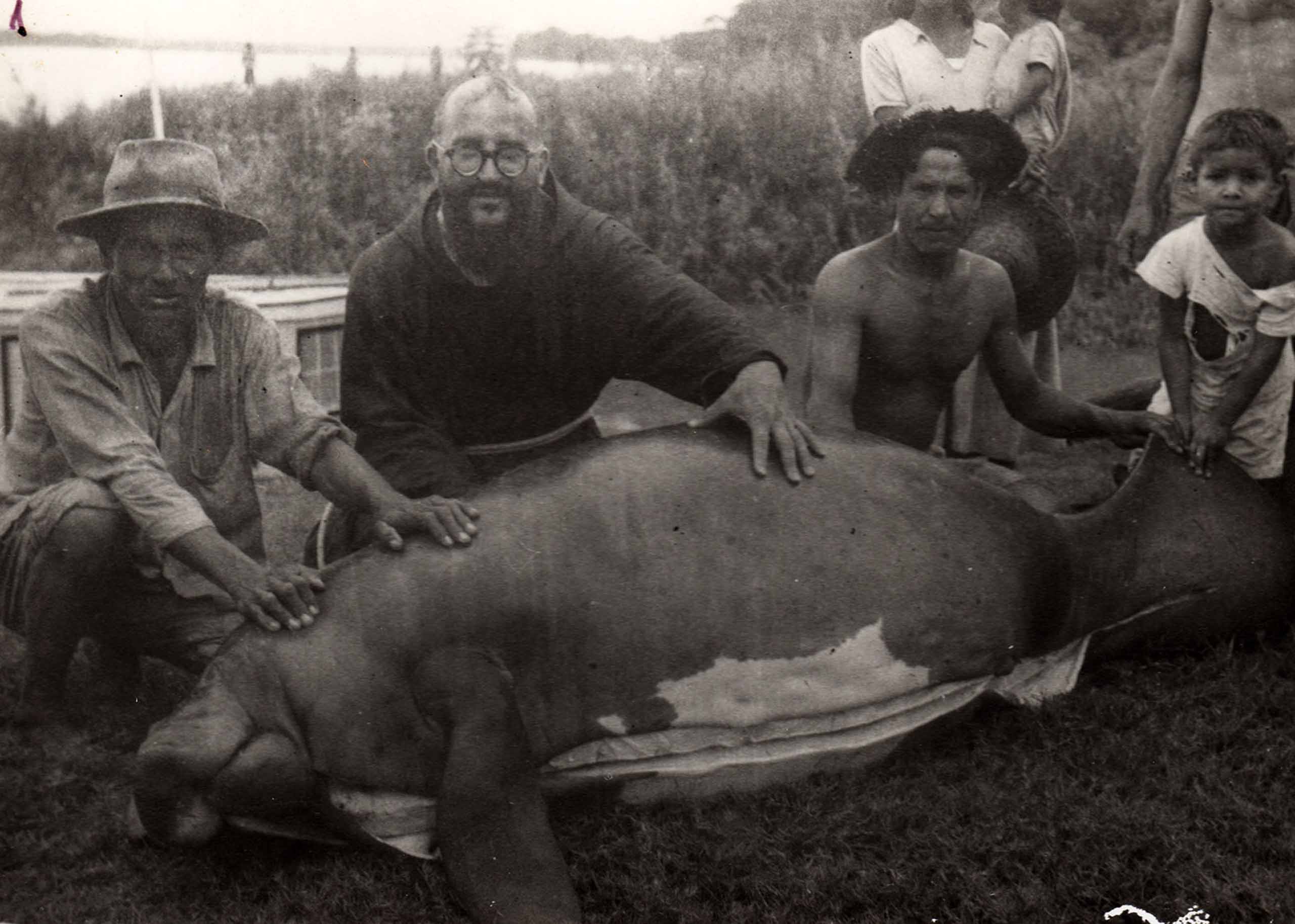Padre Samuele Di Diodato missionario in Amazzonia con gli indios Tikunas e un lamantino (Trichechus inunguis) appena pescato.